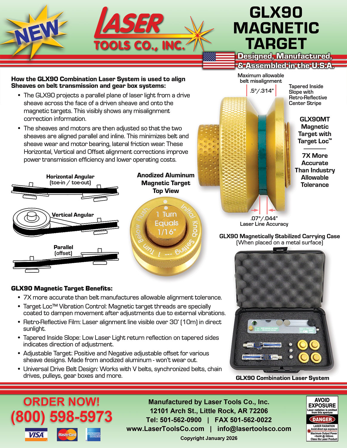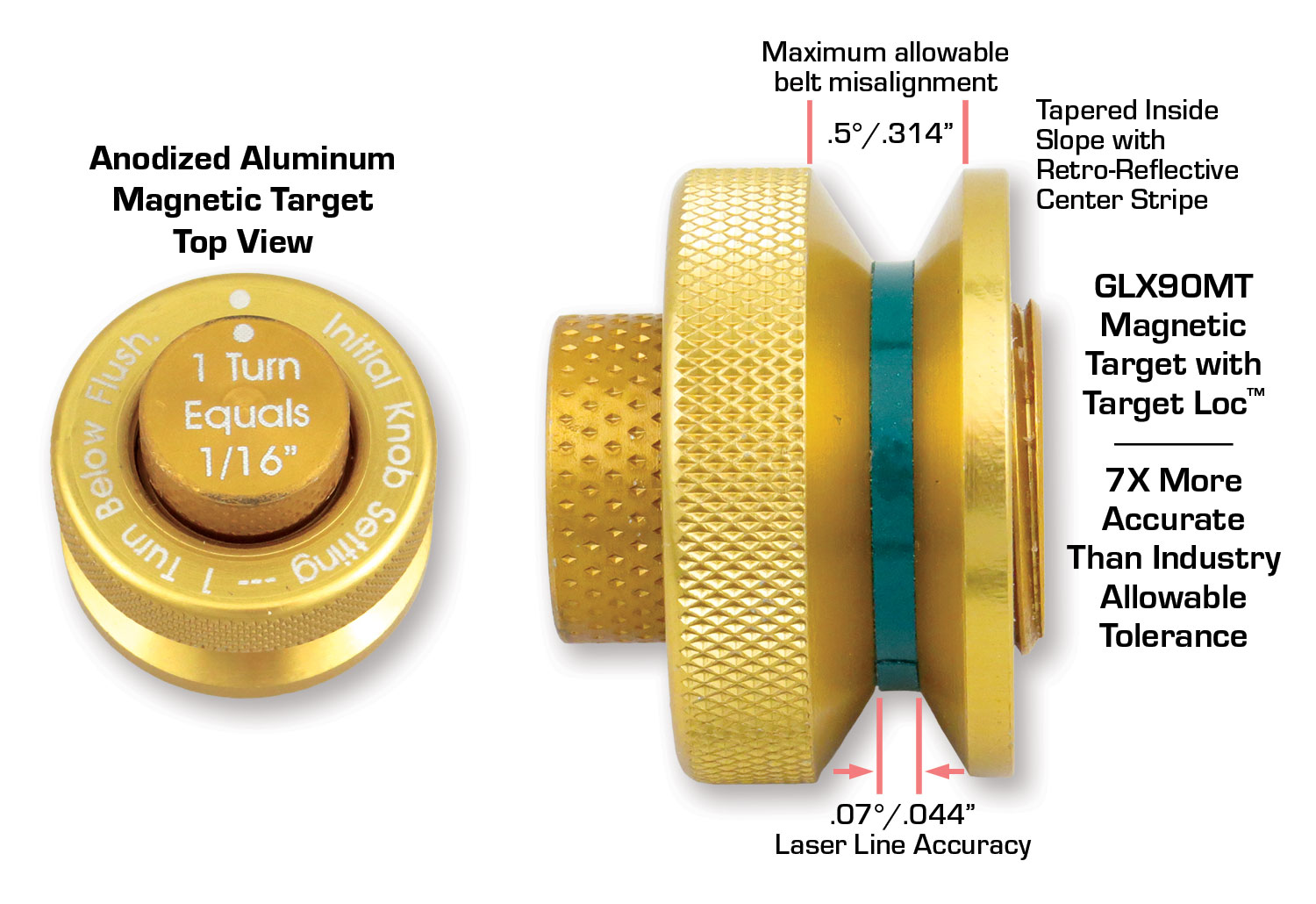 - The GLX90 projects a parallel plane of laser light from a drive sheave across the face of a driven sheave and onto the GLX90MT Magnetic Target with Target Loc™. This visibly shows any misalignment correction information.