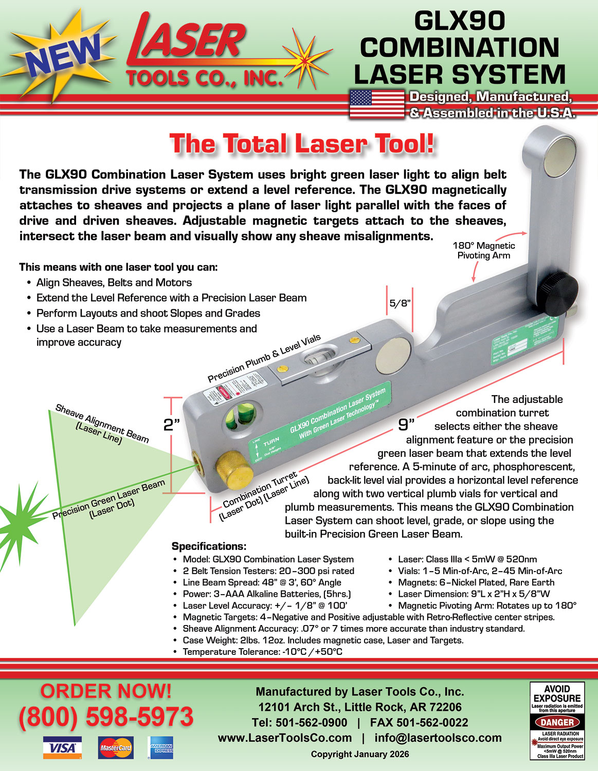 The GLX90 Combination Laser System uses bright green laser light to align belt transmission drive systems or extend a level reference. The GLX90 magnetically attaches to sheaves and projects a plane of laser light parallel with the faces of drive and driven sheaves. Adjustable magnetic targets attach to the sheaves, intersect the laser beam and visually show any sheave misalignments.